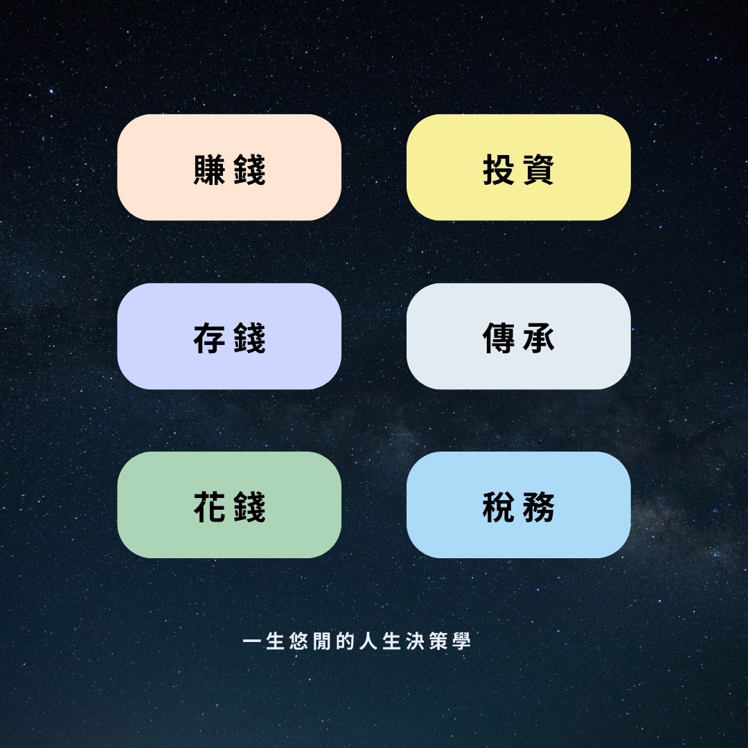 透過全面理解「賺錢、存錢、花錢、投資、稅務、傳承」這六大面向,我們能夠制定出有效的財務策略,從而在人生每個階段做出最佳的選擇。只有將這六者作為整體來考量,才能在不同時期因應各種財務需求。