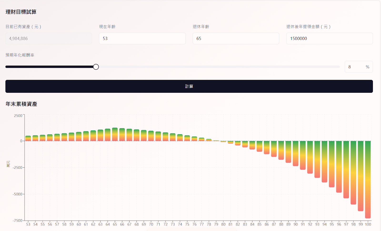 - 長條圖往下 (負值):代表以目前的資產規模趕不上提領速度,可能會在該年齡耗盡資產。這是一個預警,提醒您現在就需要調整策略 (增加投入金額、提高報酬或降低未來提領金額) 。