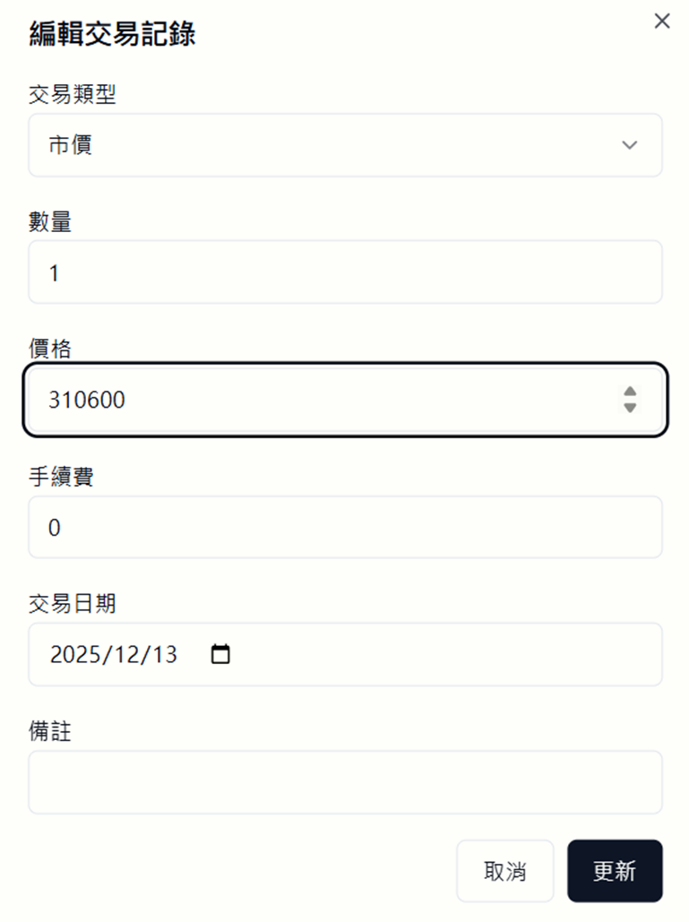 - 價格:初次建立時,可直接輸入當下的「總市值」作為買入成本