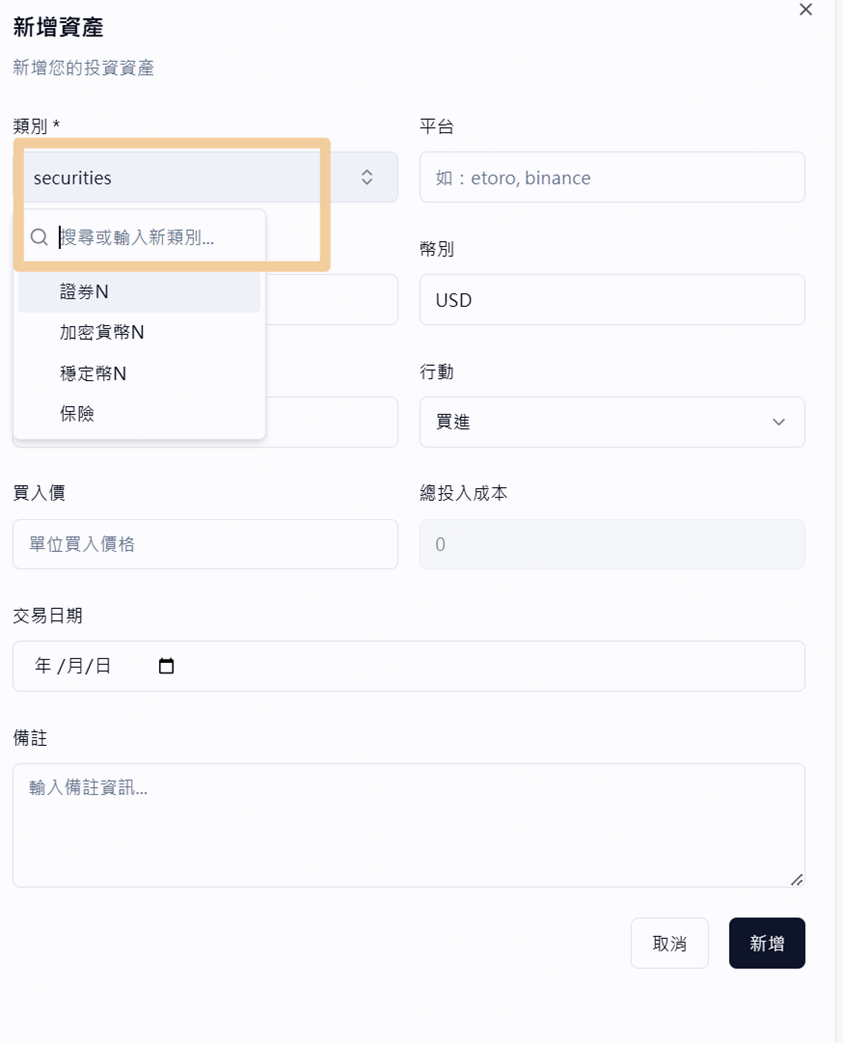 - 選擇 類別 (如:證券 N、穩定幣 N、加密貨幣 N)、平台 (如:eToro, Binance) 與幣別 。