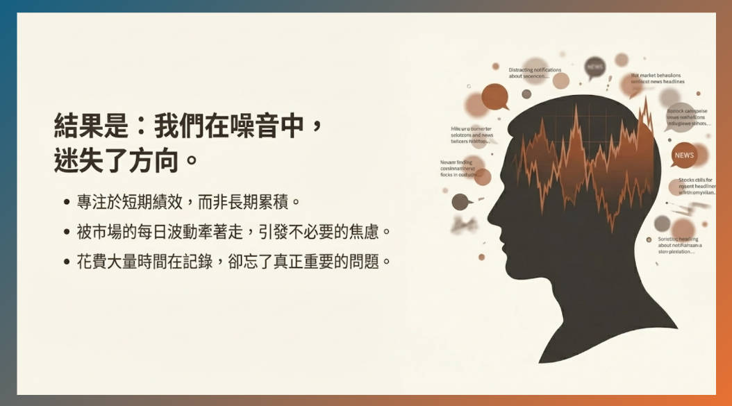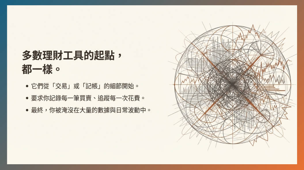 大多數理財工具從「交易」與「記帳」開始,讓人淹沒在瑣碎細節中,而真正該問的只有: