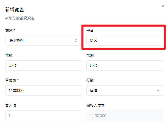 針對資產過於碎片化的使用者,您可以建立一個名為「MIX」的個人資產管理項目,初次建立時直接輸入該類別資產的「當下總市值」作為成本;數量設為「1」。