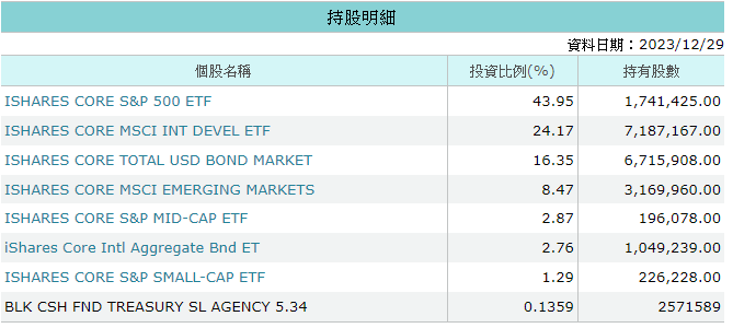 AOA 共持有七支ETF,其中標普 500 指數 ETF 為首,共分散到全球股票 10,884 檔、加上全球債券 6,118 檔,再加上最下面僅占 0.13% 的 BLK 部位,高達 26,000 多檔的持股。