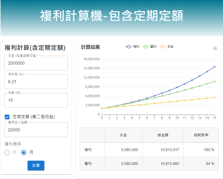 9.21% 的複利是什麼概念呢?假設我們拿出 200 萬本金放進 AOA,然後每年定期定額投入 2 萬,把它當存股,15 年可變成 1,561 萬,其收益遠勝房地產。