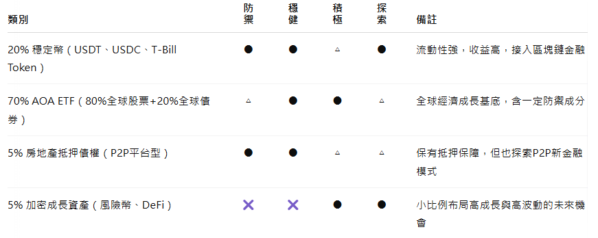 | 加密成長資產(風險型加密貨幣、DeFi) | 5% | 小比例押注未來高成長領域 |