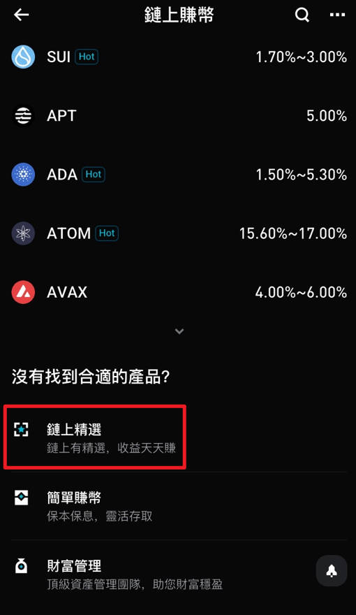 - 在 Bitget App 中,找到並進入「理財」/ 「鏈上賺幣」 / 往下滑至「鏈上精選」(On-chain Elite)產品頁面。BGUSD 屬於該平台的高階收益產品線。
