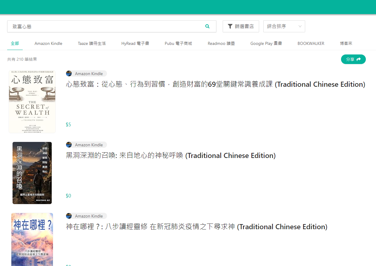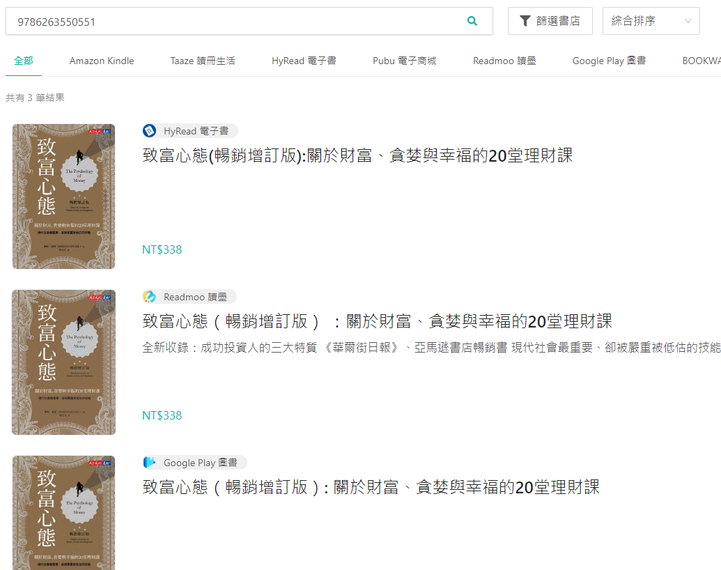 在這裡,我們可以發現來源有亞馬遜、讀冊生活(後面介紹)還有 hyread 、Google Play 圖書、讀墨等,不過有無販售也要看運氣,而且如果透過書名搜尋,常常有其他的電子書混進去。