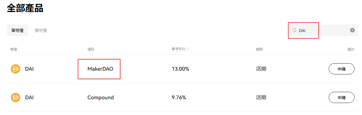 在 OKX 的「金融」選單裡,有「鏈上賺幣」,然後搜尋「DAI」,選擇項目為「MakerDAO」,即可申購,持有活存美債。
