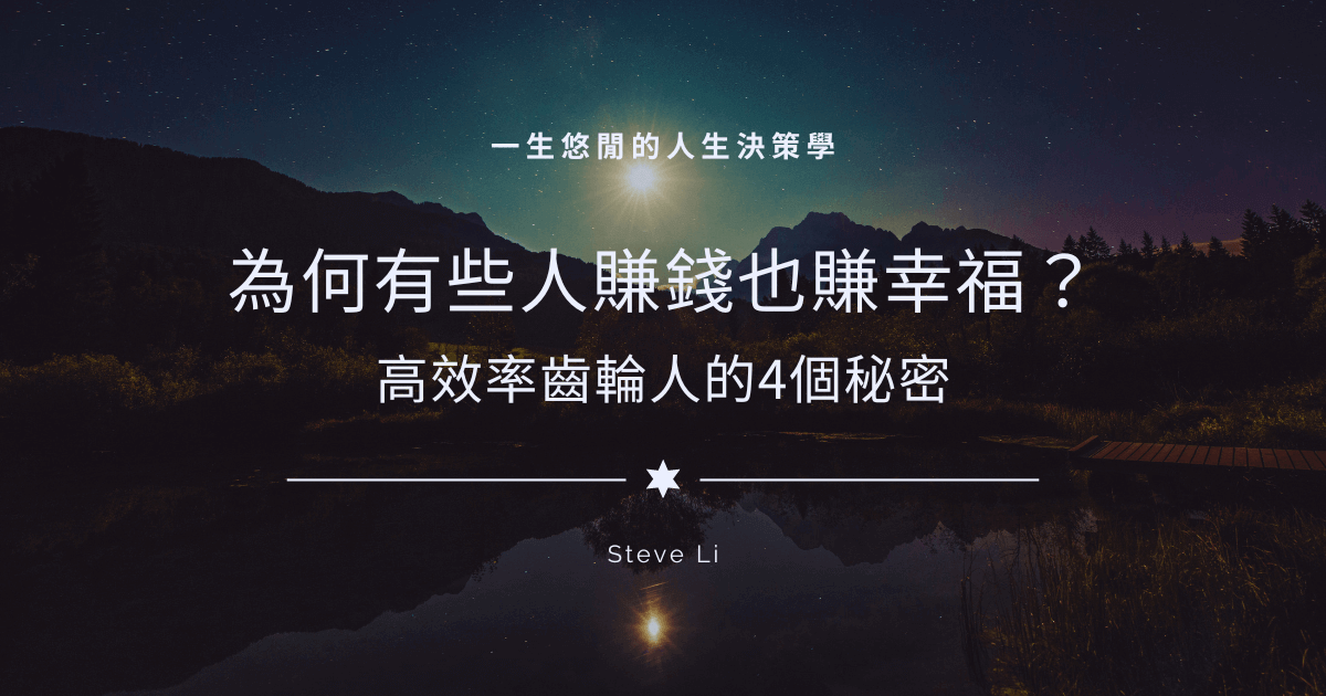 為何有些人賺錢也賺幸福?高效率齒輪人的4個秘密 2024/05/06 | 個人成長, 工作效率, 建立習慣, 時間管理, 獨立思考 高效率的行動,來自於有效的思維模式。我將高效率的思維模式比喻為「齒輪」,具備齒輪思維的人比喻為「齒輪人」。 為何有些人賺錢也賺幸福?高效率齒輪人的4個秘密 完整文章 »