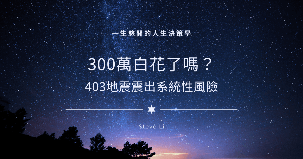 300萬白花了嗎?403地震震出系統性風險 2024/04/09 | 未分類 有苦主質疑自己剛買房就被震到不能住,連一天都沒住過,上百萬是否打水漂?很遺憾,機率很大。 這得讓我們經常省察自己的資產或決策是否處於系統性風險之中。 300萬白花了嗎?403地震震出系統性風險 完整文章 »