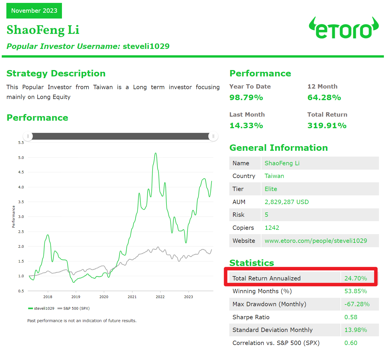 單以績效來看,我在 eToro 的只有個股與少量加密貨幣組合,換成年平均報酬率為 24.7%。