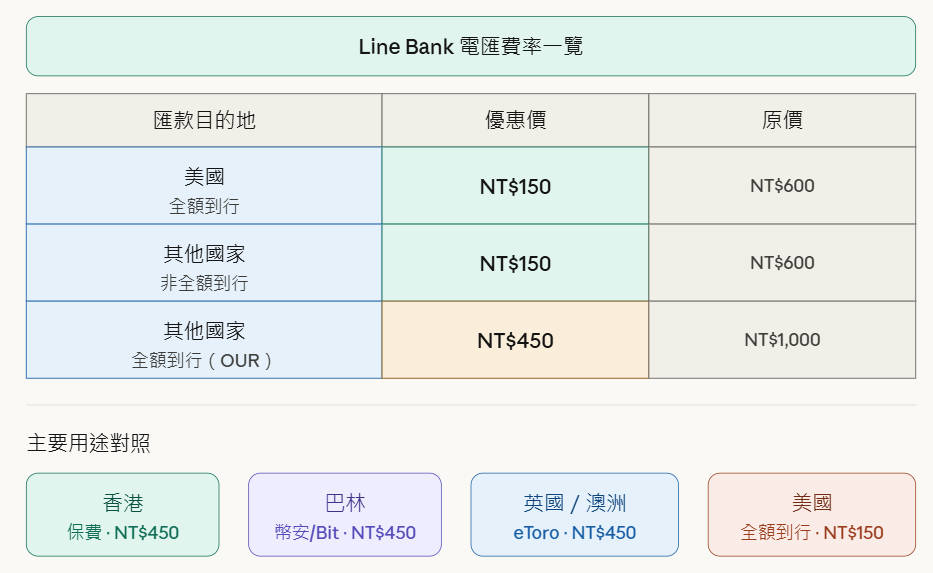 Line Bank匯往其他國家且要求全額到行(OUR 電匯,即所有手續費由你負擔、對方收到完整金額),優惠價 450 元(原價 1,000 元)。