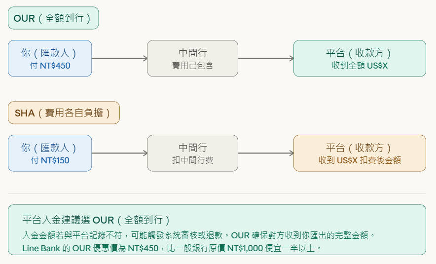我們的情境建議: 匯到幣安、Bit、eToro 這類平台,都建議選全額到行(OUR),費用 NT$450,比較透明。