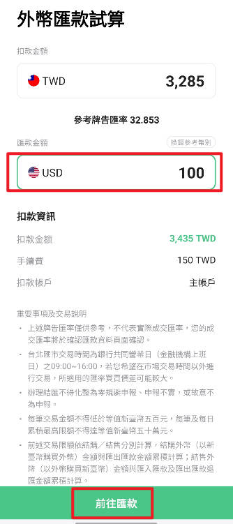 - 進入「外幣匯款試算」頁,輸入匯款金額(可選美元或新臺幣,選新臺幣系統將依當下匯率自動換算),按「前往匯款」。