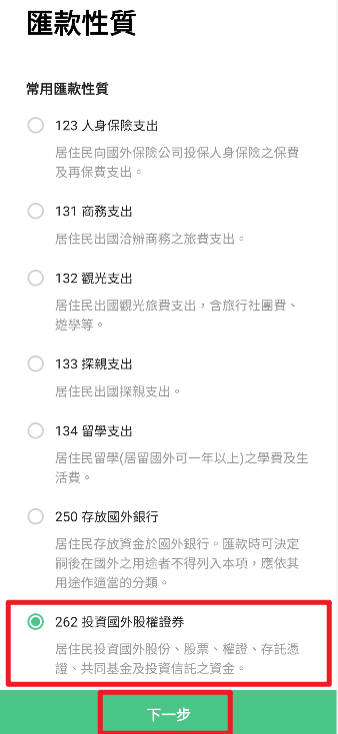 - 選擇匯款性質(例如:262 投資國外股權證券、311 保險費等)