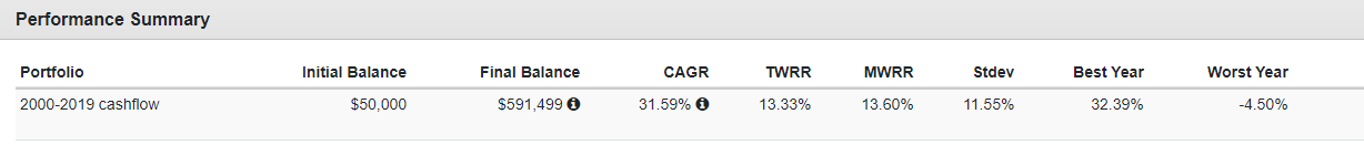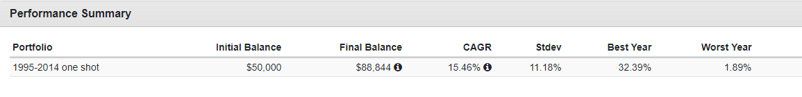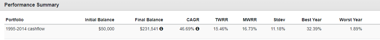 - C組:1995-2014年,在股市上漲時進場,單筆投資+定期定額(cashflow)。