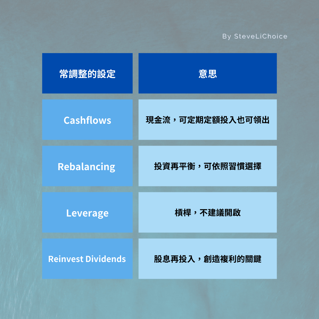 由於 Backtest 採用全英文,又是專業術語,也沒有跨國語言設定,所以這邊簡單做個名詞解釋。在了解這些名詞後,我們就能根據自己的需求調整參數,模擬真實的投資環境。