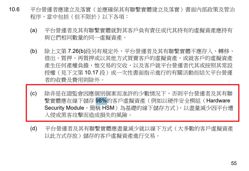 根據香港證監會《適用於虛擬資產交易平台營運者的指引》,OSL 這類持牌平台原則上須將 98% 的客戶虛擬資產存放於冷儲存,只保留最多約 2% 於熱錢包或其他線上環境。