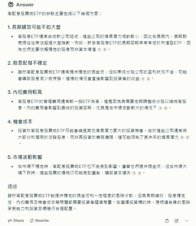 Perplexity 提出的缺點相當客觀,許多投資者容易忽略高配息商品的總報酬遠不如成長型標的。透過 Perplexity,我們有機會找出過去的投資盲點。
