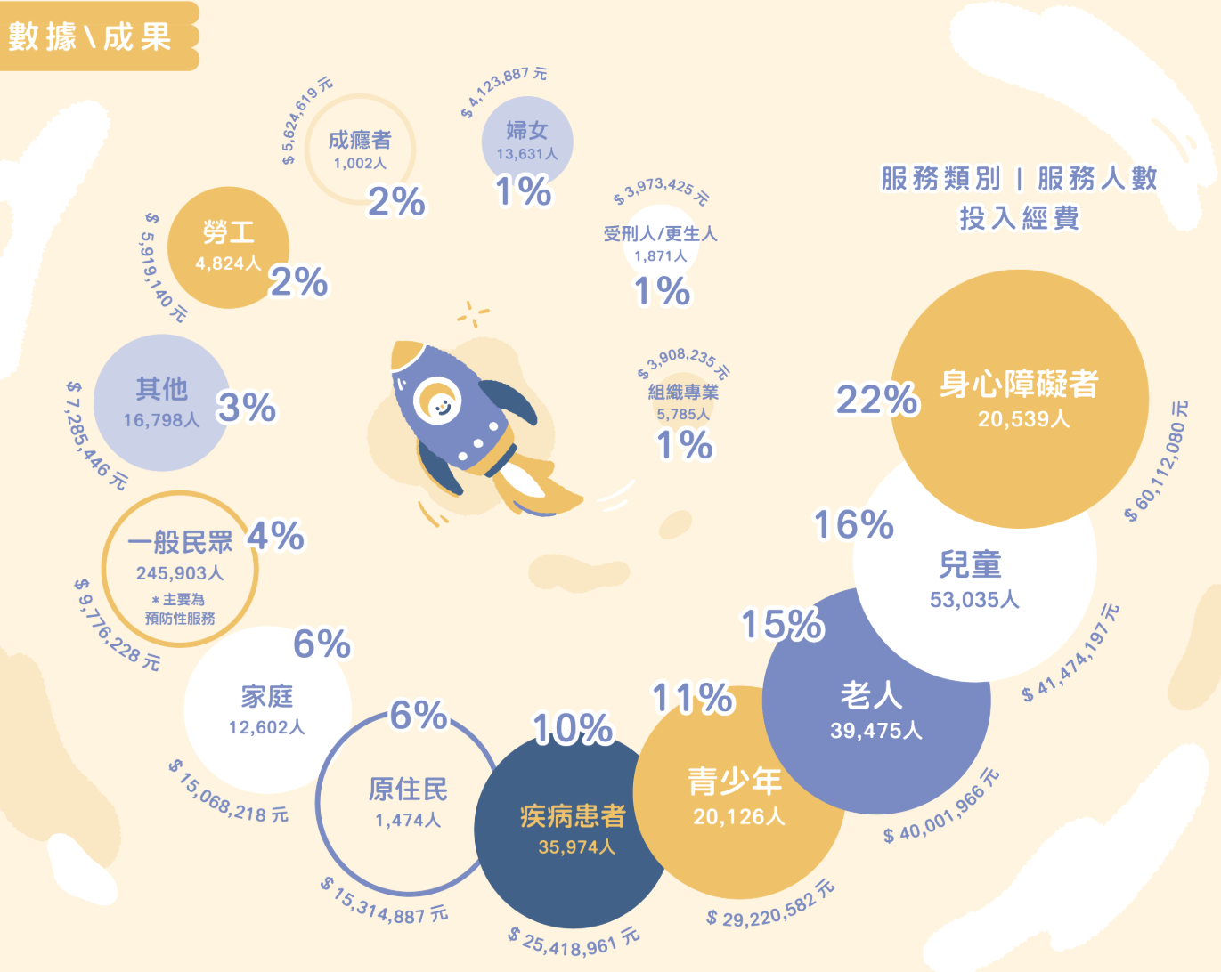 | 微型團體補助 | 297 個團體,總預算約 3,400 萬元,平均一個偏鄉機構 11 萬,未來目標 20 萬 / 個 |
