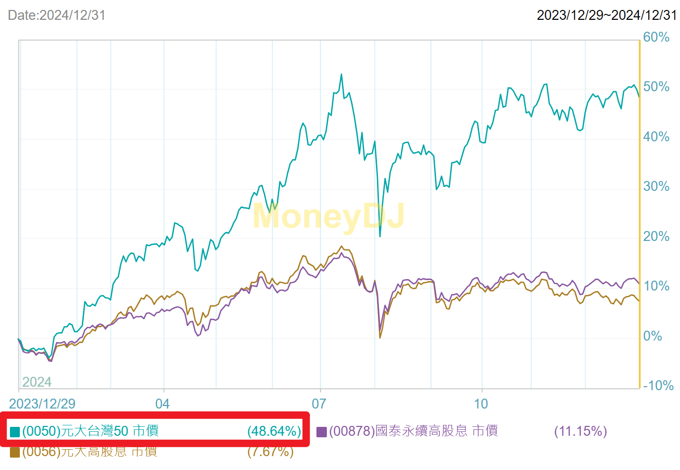 以投資台股為例,比較基礎是大盤 0050。2024 年的 0050 報酬率為 48%。