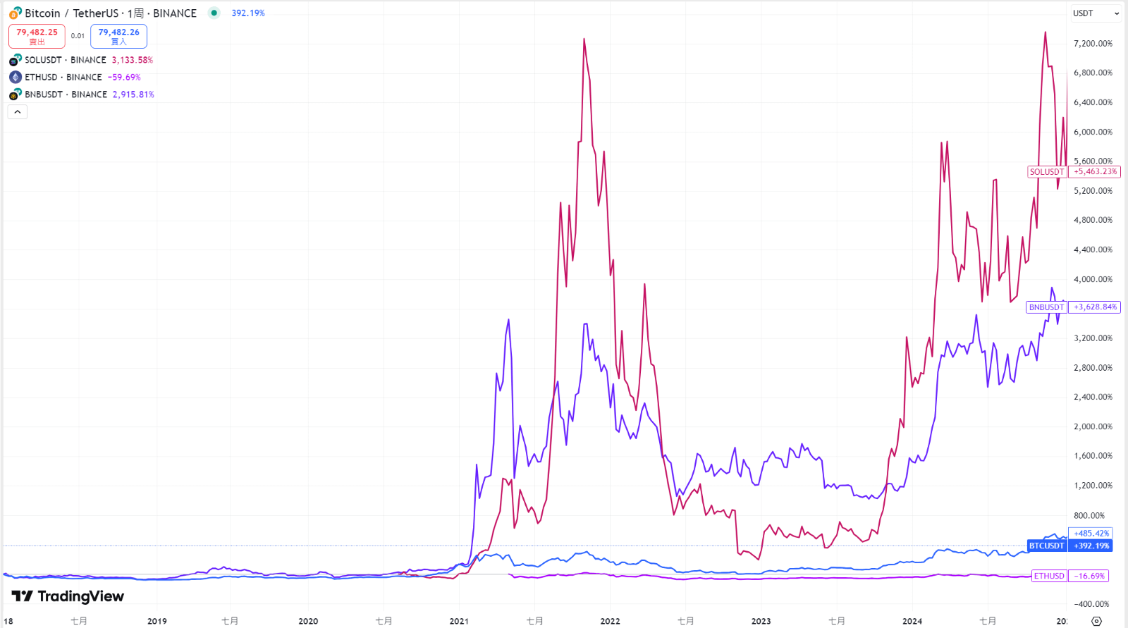 以加密貨幣為例,2018 年起漲到 2021 年,2022 年一度滑落至谷底,2024 年再創高峰,因此這幾年有配置加密貨幣的朋友,資產都成長不少。