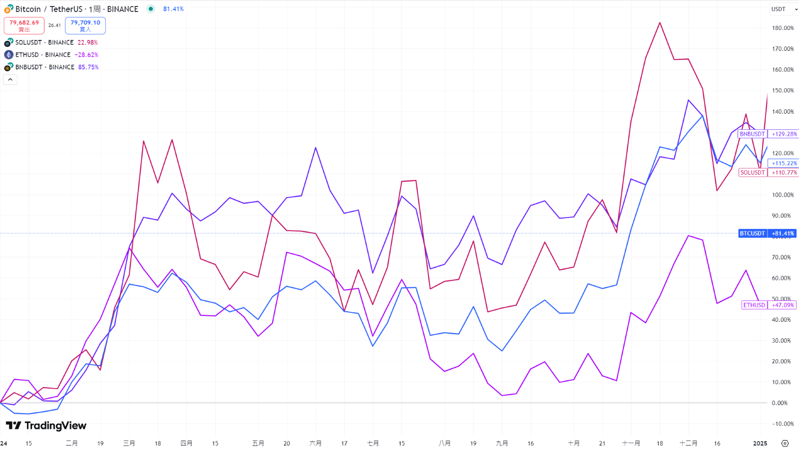 以 2024 年來說,因為資產中有配置 5% 的加密風險幣,大哥比特幣帶頭衝,小弟其他幣種跟著上,相信大家的資產都有水漲船高的趨勢。