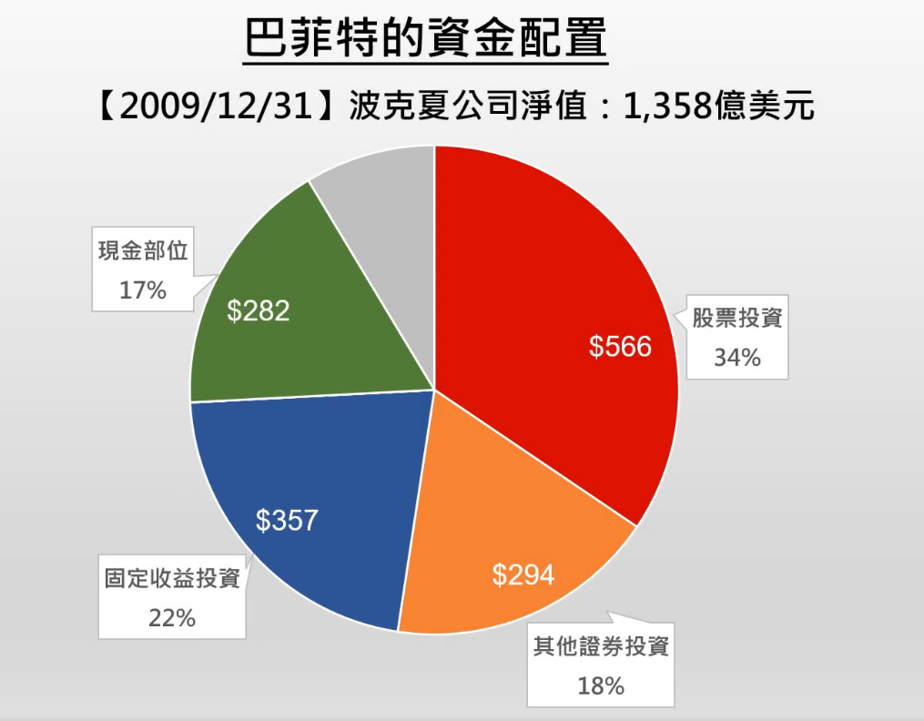 從圖表可以看出,早期( 2009 年),波克夏有大量現金部位,很接近富人持有的約 2 成現金比例,而股票僅佔 34%,很符合他保守謹慎的性格。