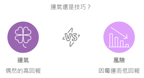 多數投資人很少關注運氣與風險(霉運)因素。如果一位投資人剛好在大漲前進場,並且幸運地選中了上漲的標的,那麼他的投資報酬率就有可能遠高於市場平均,並將其歸功於自己股神般的明智決策;但如果他剛好在大跌之前進場,並且選中了下跌的標的,那麼他的投資報酬率就有可能遠低於市場平均。